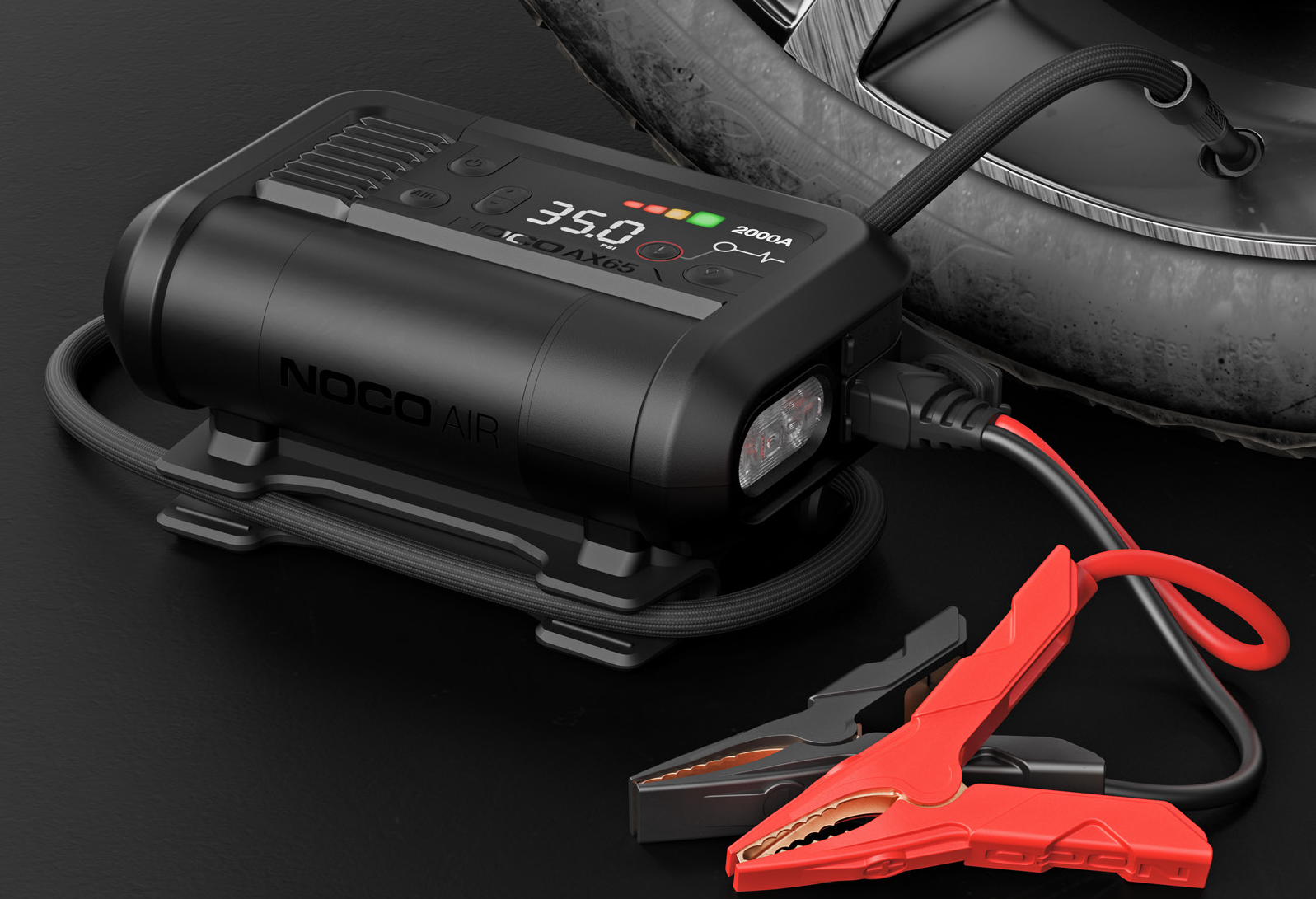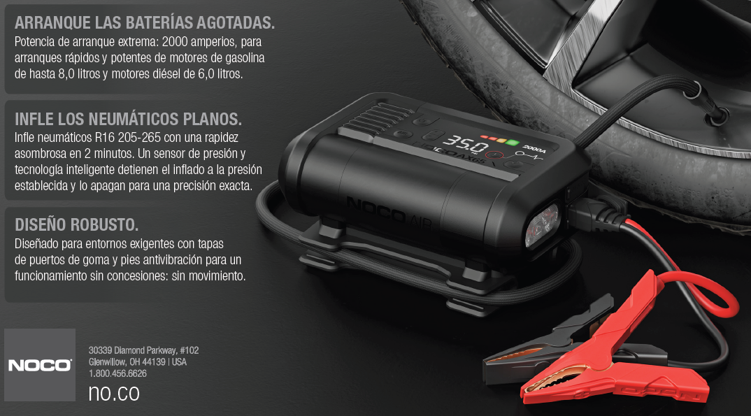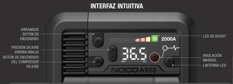 El NOCO Boost-X AX65 es un arrancador de batería de litio profesional con 2000A de potencia de arranque, diseñado para motores de gasolina de hasta 8,0 litros y diésel de hasta 6,0 litros. Además, incorpora un compresor de aire inteligente de 22A, capaz de inflar neumáticos R16 205-265 en apenas 2 minutos, con apagado automático al alcanzar la presión configurada.