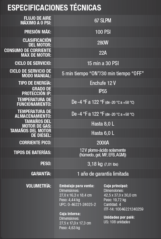 Arranca motores de gasolina hasta 8,0 L y diésel hasta 6,0 L.