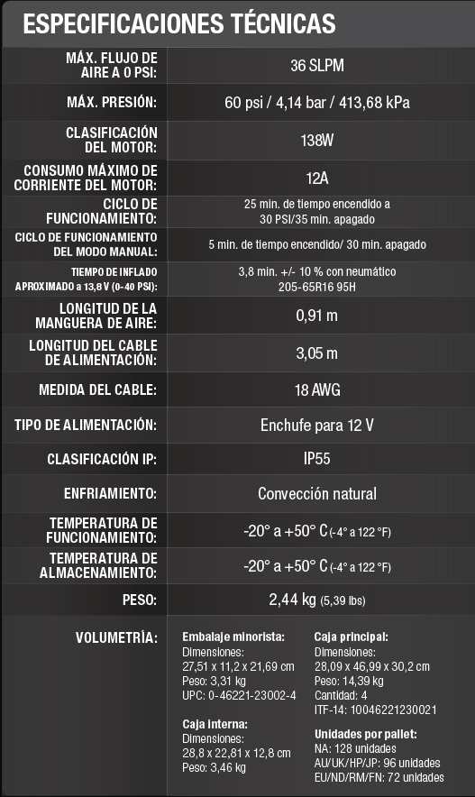 Su rendimiento es óptimo: puede trabajar durante hasta 25 minutos continuos a 30 PSI, lo que permite inflar múltiples neumáticos sin necesidad de pausas frecuentes.