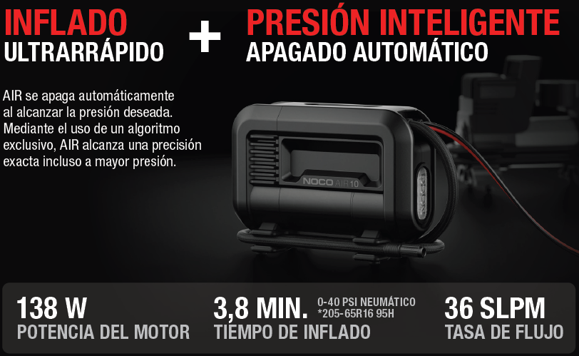 El NOCO AIR10 es un inflador portátil de 12 V con motor de 138 W que alcanza una presión máxima de 60 PSI (4,14 bar). Inflar desde 0 a 40 PSI le toma apenas 3,8 minutos (para neumáticos tipo 205/65R16), y un “top-up” de 35–40 PSI en solo 41 segundos.